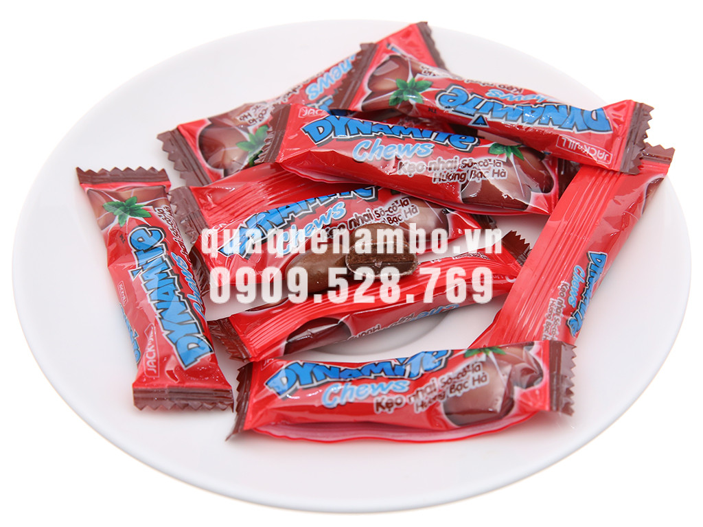 | Kẹo Dynamite Chews | Đường, mạch nha, bột cacao (6,5%), chất béo thực vật, bột malt, chất giữ ẩm, bột sữa, hương tổng hợp, chất làm dày, maltodextrin, gelatin, chất nhũ hóa, màu thực phẩm tổng hợp, chất làm bóng.