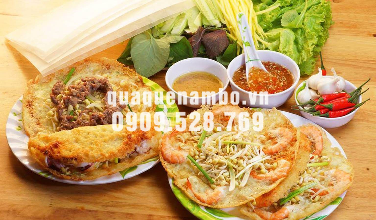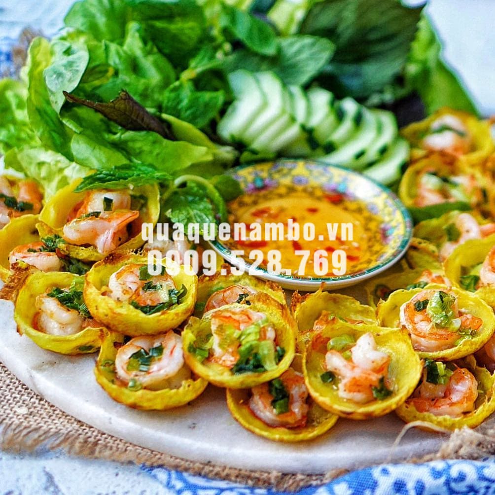 Món bánh này được làm từ bột gạo pha loãng, sau khi đổ bánh xèo sẽ thêm tôm đất tươi cùng những nguyên liệu khác như giá đỗ, thịt lợn, hành lá,… rồi cuốn với bánh tráng và rau sống, chấm với nước mắm chua ngọt.