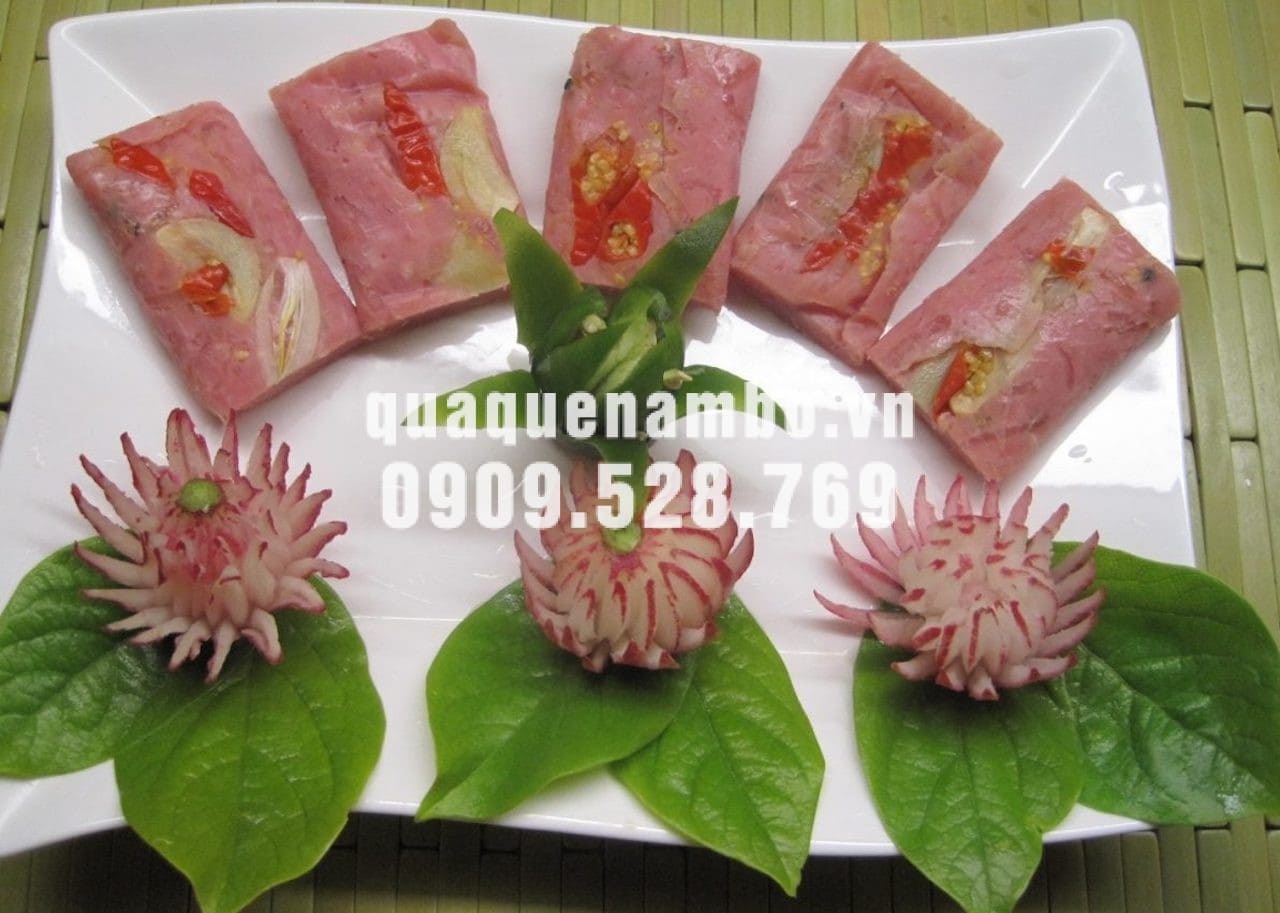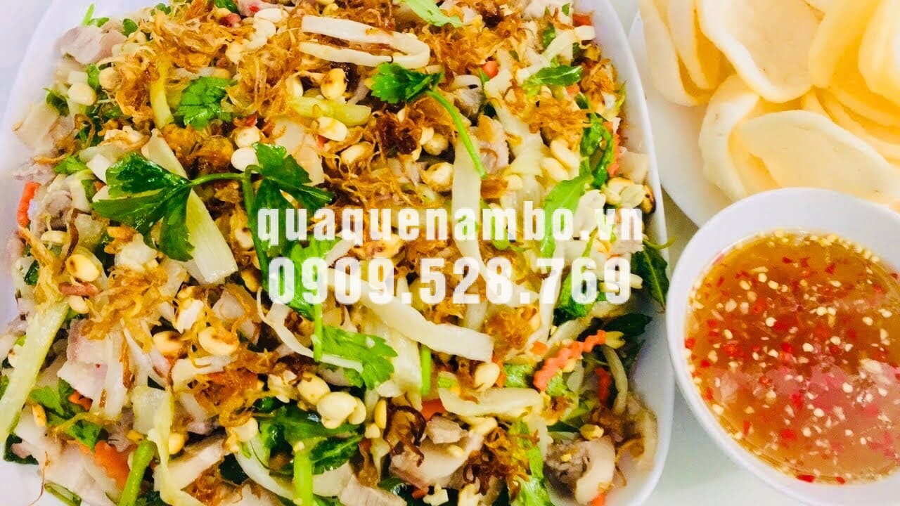Món ăn này được làm từ ngó lục bình, tôm sú bóc vỏ và thịt lợn luộc thái lát mỏng. Các nguyên liệu đã được sơ chế sẵn, bạn chỉ cần trộn đều cùng rau răm và gia vị, sau đó cuộn lại và chấm nước mắm để thưởng thức.