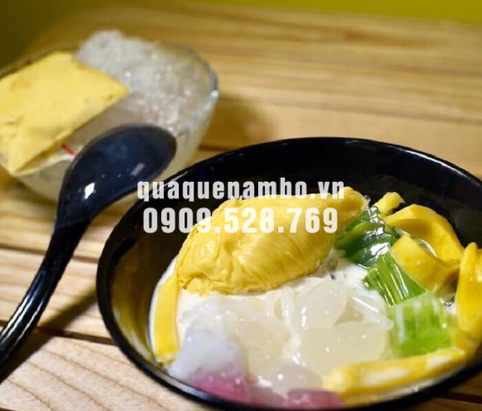 Chè sầu riêng với nguyên liệu được làm từ hoa quả gồm mít, nhãn, sầu riêng cùng các loại hạt và thạch. Chè được bày trong tô sứ có miệng rộng, khi ăn bạn sẽ cảm nhận được sự mềm mịn của những miếng thạch màu xanh đỏ, vị giòn dai của hạt đác rim. Ngoài ra, còn thêm vị thanh mát của trái cây miền Tây cùng mùi thơm nức, béo ngậy của sầu riêng đẫm trong nước cốt dừa ngọt bùi.