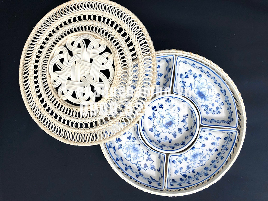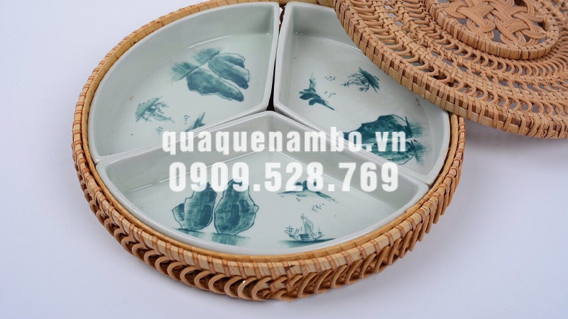 Khay đựng mứt Tết sứ Bát Tràng mang đậm nét bản sắc của dân tộc Việt, dù mộc mạc, không cầu kỳ nhưng lại bắt mắt. Chiếc khay được thiết kế theo các hủ nhỏ có kiểu dáng đẹp mắt với đế kèm theo là lớp giỏ đan bằng mây tre.